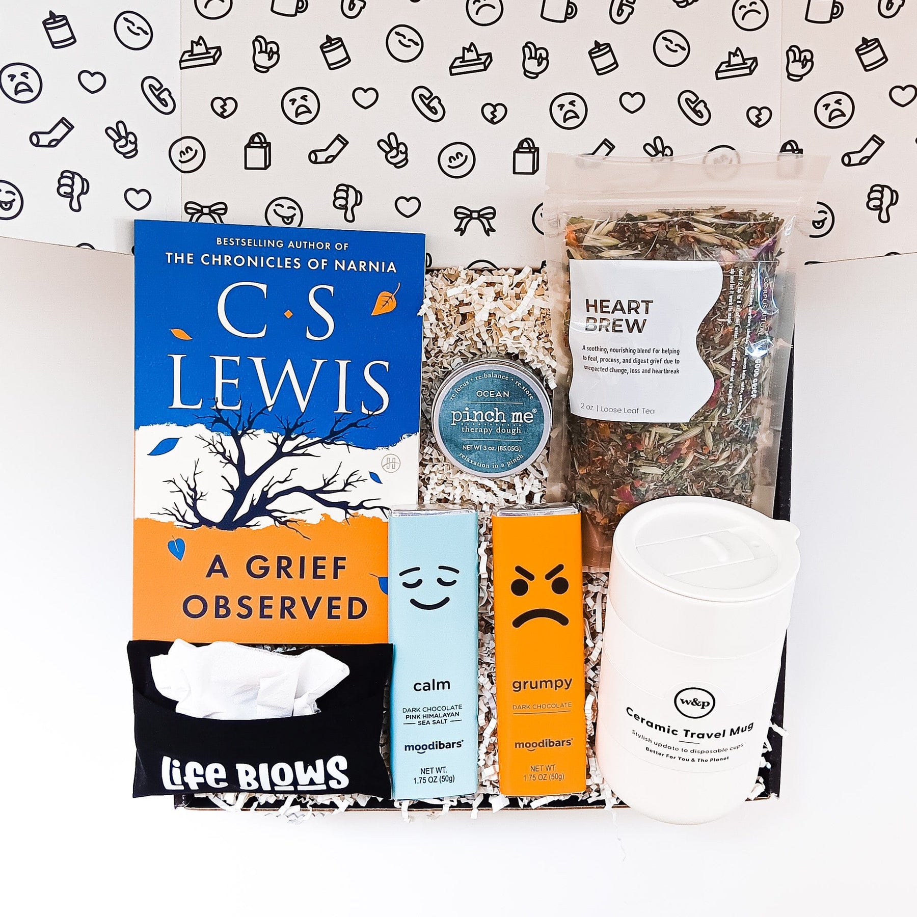 Meet the ultimate companion for those Netflix marathons, ugly cries and emotional eating sessions. We get it - grief is messy, complicated and downright exhausting. That's why we've curated this care package with items to help you weather the storm with a touch of humor and a whole lot of comfort. The book contains 75 lists to help you understand and move through grief, while the tissues, chocolate, socks and weighted sleep mask are best kept nearby for those moments when life hits you right in the feels.